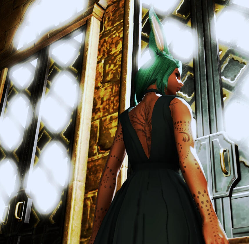 Common Accessories: in public, I will nearly always wear gloves of some sort. I also wear a small leaf fashioned in gold, with a dull grey gem in the center, in the center of my forehead. No, it is not a Garlean conceit. I know what I am.Personal: